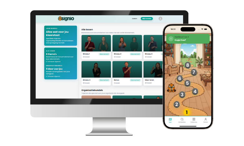 Met de gratis versie van Signio kun je direct starten met de woordenbank en collecties. Handig als je snel een gebaar wilt opzoeken of tussendoor iets nieuws wilt leren.